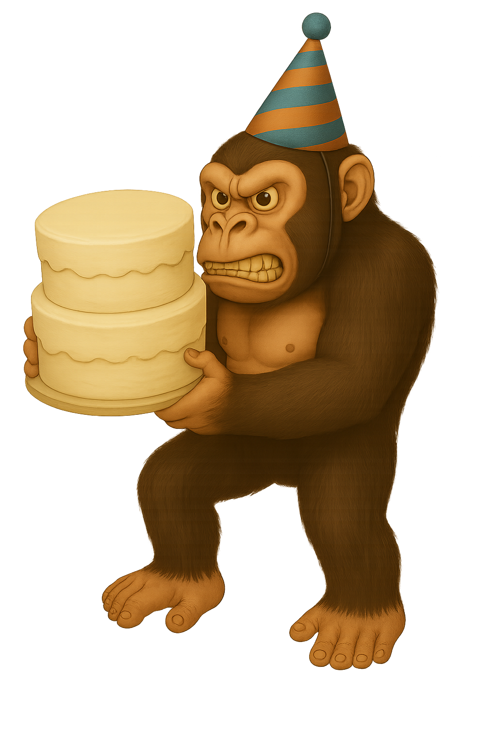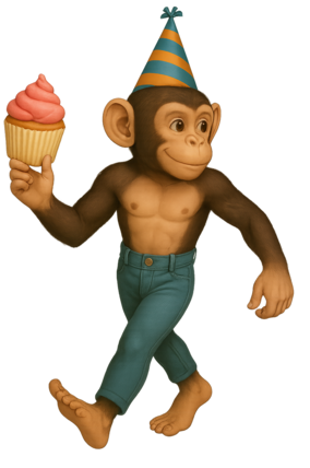 Get ready for the ultimate birthday adventure! Your special honoree is the star in this thrilling journey to the epic birthday bash you've planned. But beware—a mischievous gang of monkeys is out to spoil the surprise! Armed with cupcakes, the VIP must fend off these foes, facing tougher challenges from chimpanzees, acrobat monkeys, and a formidable gorilla.